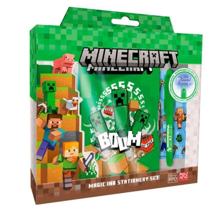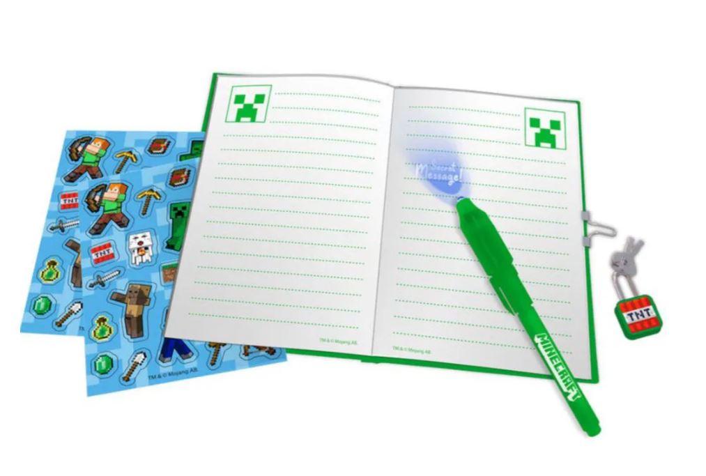 Dárková sada notesu, tajného pera a samolepek s motivem Minecraft.