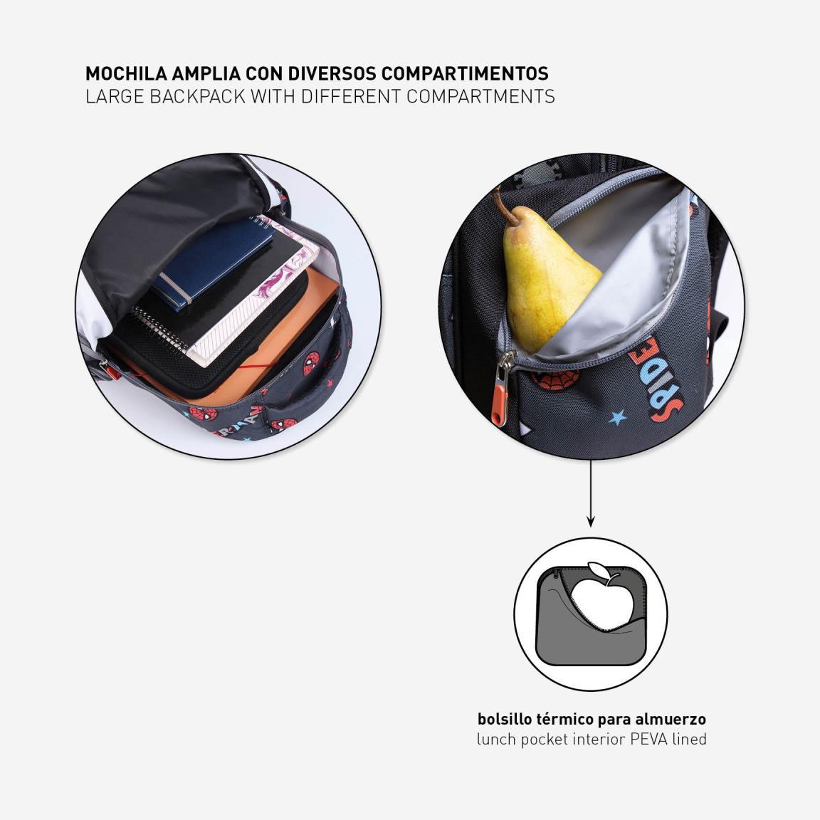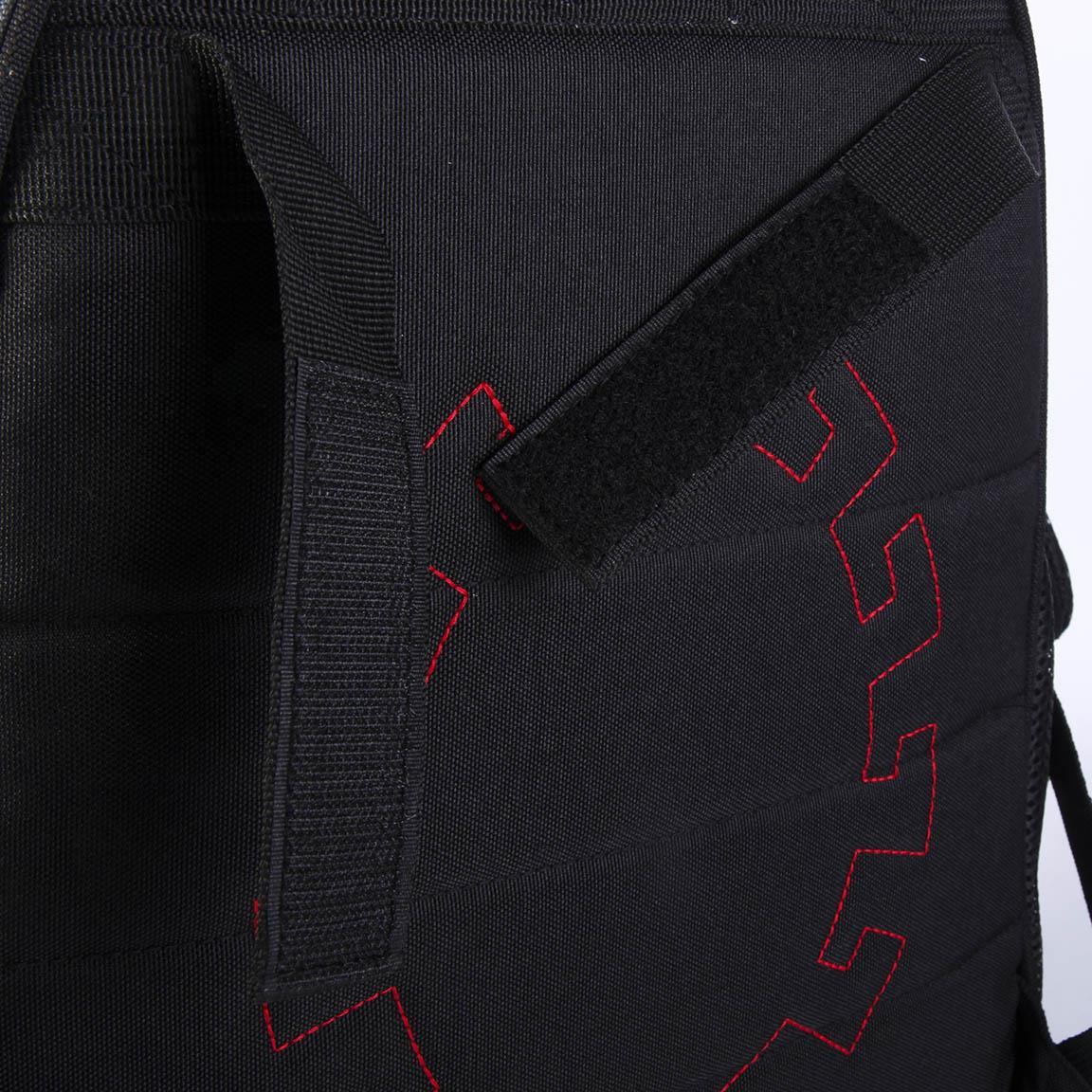 Jedna hlavní a dvě velké přední kapsy. Boční kapsa na nápojovou láhev.