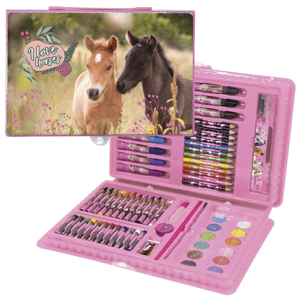 Potisk s motivem Koně je na všech dílech sady a na uzavíratelném plastovém  kufříku s ouškem.
